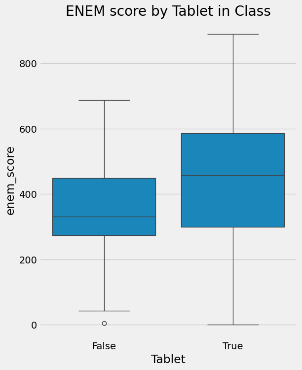 sns.boxplot(y="enem_score", x="Tablet", data=data).set_title('ENEM score by Tablet in Class')