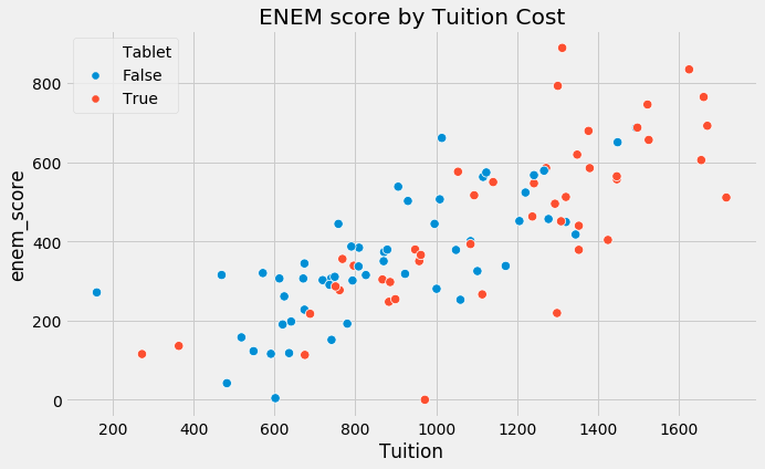 sns.scatterplot(x="Tuition", y="enem_score", hue="Tablet", data=data, s=70).set_title('ENEM score by Tuition Cost')
