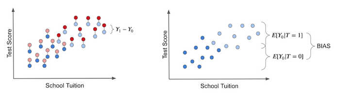 在右边的图中,我们描述了我们之前讨论过的偏差是什么。如果我们让每个人都不接受干预,我们就会产生偏差。在这种情况下,我们只剩下 \(T_0\) 潜在结果。然后,我们看到干预组和未干预组有何不同。如果他们这样做,则意味着干预之外的其他因素导致干预组和未干预组的不同。这就是偏差,是真实干预效果的阴影。