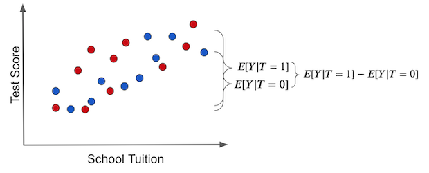 - 干预因素本身之外,干预组和未干预组之间的其他差异。在这种情况下,干预组和未干预组的区别在于干预组的学费要高得多。考试成绩的一些差异可能是由于更高的学费带来了更好的教育。
