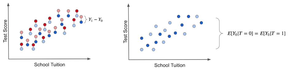 真正的干预效果只有在我们拥有观察潜在结果的神力时才能获得,如下左图所示。个体干预效果是该单位的结果与同一单位在获得替代治疗的情况下将具有的另一个理论结果之间的差异。这些是反事实结果,以浅色表示。