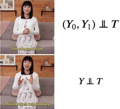 起初这可能会令人困惑(至少对我来说)。不过别担心,勇敢而真诚的伙伴,我会进一步解释的。如果结果与干预无关,这是否也意味着干预没有效果?嗯,是!但请注意,我不是在谈论结果。相反,我在谈论潜在 结果。潜在的结果是在干预 (\(Y_1\) ) 或控制 (\(Y_0\) ) 下结果 本来 会是怎样的。在随机试验中,我们不 希望结果独立 于干预,因为我们认为干预会导致 结果。但我们希望潜在 结果独立于干预。