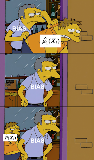 现在我们已经了解了双重稳健估计器,让我们来看看为什么它如此出色。首先,它被称为双重鲁棒,因为它只需要模型之一,\(\hat{P}(x)\)\(\hat{\mu}(x)\) 是正确的指定的。要了解这一点,请查看估计 \(E[Y_1]\) 的第一部分并仔细查看它。
