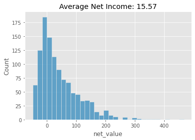 为此,我们将筛选测试集,以仅包含定义为盈利的区域中的客户(根据我们的训练集)。然后,我们将绘制这些客户的净收入分布图,并显示我们保单的平均净收入。