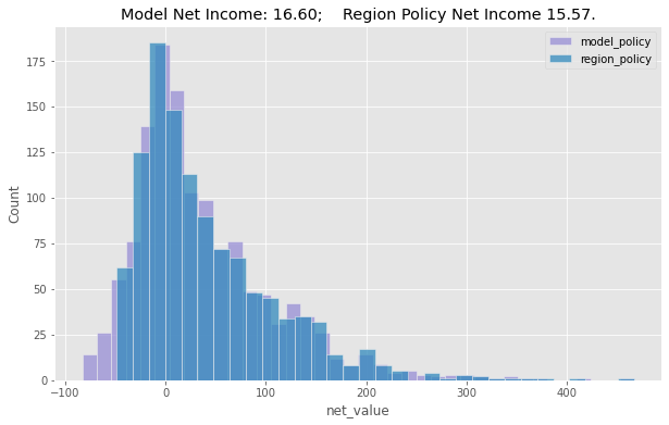 plt.title("Model Net Income: %.2f; Region Policy Net Income %.2f." %