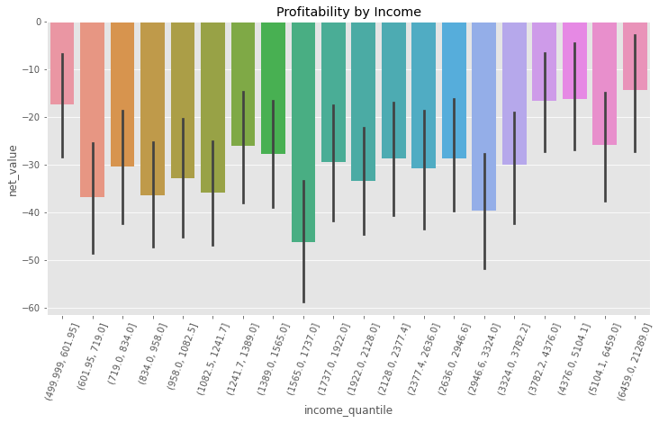为了弄清楚这一点,我们可以将数据划分为收入分位数(分位数具有将数据划分为大小相等的分区的适当性,这就是我喜欢它们的原因)。然后,对于每个收入分位数,让我们计算平均净值。这里的希望是,尽管平均净值为负, \(E[NetValue]<0\),但可能存在一些由收入定义的子人口,其中净值为正,\(E[NetValue|Income=x]<0\),可能是更高的收入水平。