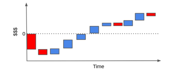 每个条形代表您与客户关系中的一个金钱事件。例如,要立即获得客户,您需要投资于营销。然后,在某人决定与您开展业务后,您可能会产生某种入职成本(您必须向客户解释如何使用您的产品)或安装成本。只有这样,客户才开始产生每月收入。在某些时候,客户可能需要一些帮助,而您将承担维护费用。最后,如果客户决定终止合同,您可能也会为此承担一些最终成本。