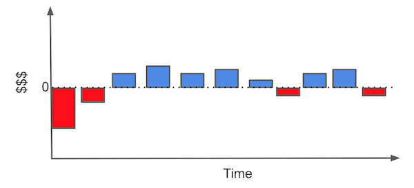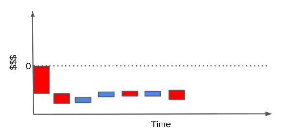 从客户获取的角度来看,您通常需要做的是弄清楚谁是有利可图的客户。在这个问题中,每个客户都有获取成本(可能是营销成本、入职成本、运输成本……),并有望为公司带来正现金流。例如,假设您是一家互联网提供商或一家天然气公司。您的典型客户可能有一个看起来像这样的现金流。