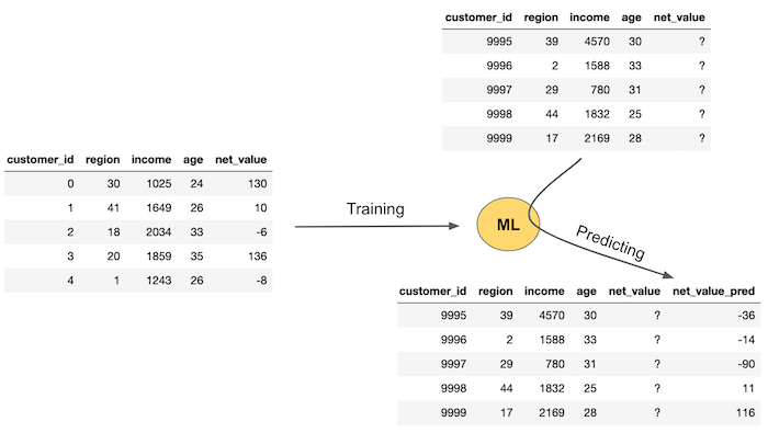 首先,您需要知道基本事实(此处为net_value)的数据。然后,您训练一个 ML 模型,该模型将使用特征(在本例中为区域、收入和年龄)来预测net_value。此训练或估计步骤将生成一个机器学习模型,当您还没有真正的net_value时,该模型可用于预测net_value。这显示在图像的左侧。你有一些新的数据,你有特征(地区,收入和年龄),但你还不知道net_value。因此,您将这些数据传递到模型中,它为您提供了net_value预测。