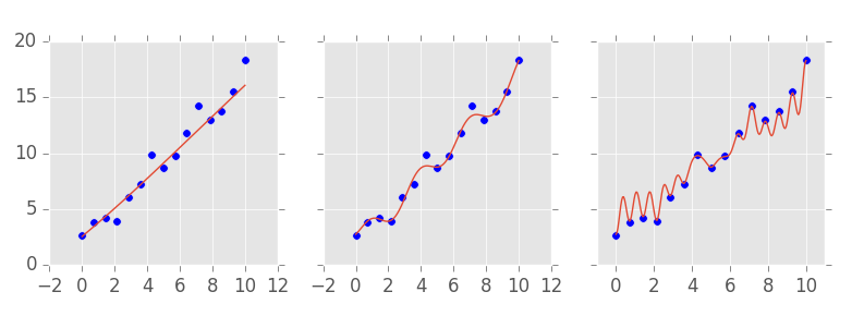 此外,拥有一个非常复杂的模型通常不是一件好事。你对为什么不好其实已经有一些直觉。例如,在上图中,您更倾向哪个模型?是更复杂,能得到所有的正确预测哪个吗?可能不是。您可能更倾向于中间的那个。它更平滑,更简单,同时,它仍然能做出一些很好的预测,即使它不是无误差地拟合了数据。