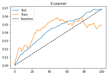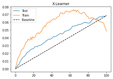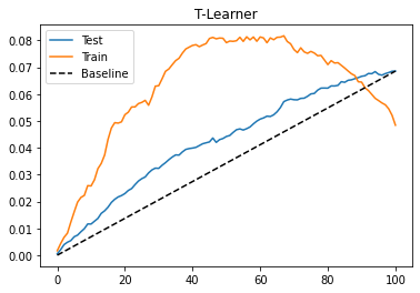 T-learner 在此数据集上也表现良好。测试性能看起来与我们使用 S-learner 获得的结果没有太大区别。或许是因为干预没有那么弱吧。此外,我们可以看到训练性能远高于测试性能。这表明模型过度拟合。之所以会发生这种情况,是因为我们只在数据的一个子集上拟合每个模型。使用较少的数据点,模型可能会学习一些噪音。