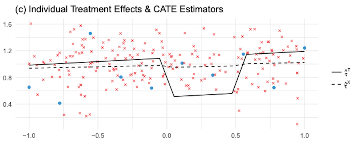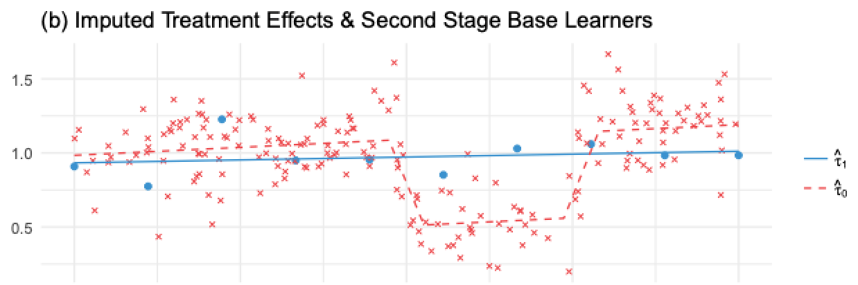 这里发生的是未干预数据对应的模型可以拾取非线性,但干预数据对应的模型不能,因为我们使用正则化来处理小样本。当然,您可以在该模型上使用较少的正则化,但样本量太小会导致过度拟合。似乎我们进退两难。为了解决这个问题,我们可以使用 Kunzela 等人在同一篇论文中提出的 X-learner。.