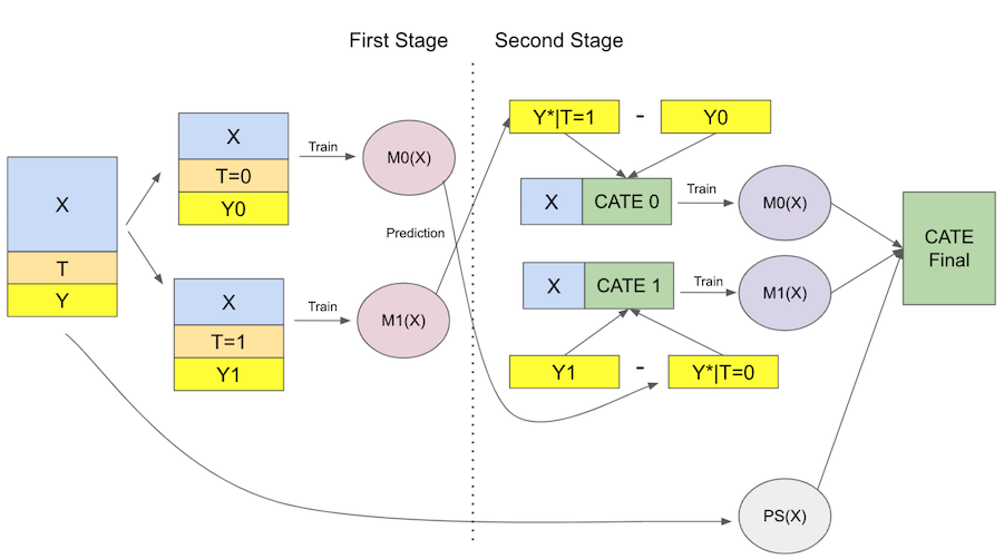 X-learner 比之前的 le​​arner 解释起来要复杂得多,但它的实现非常简单,所以不用担心。 X-Learner 有两个阶段和一个倾向评分模型。第一个与 T-learner 相同。首先,我们将样本分成处理过的和未处理过的,并为处理过的和对照拟合一个 ML 模型。